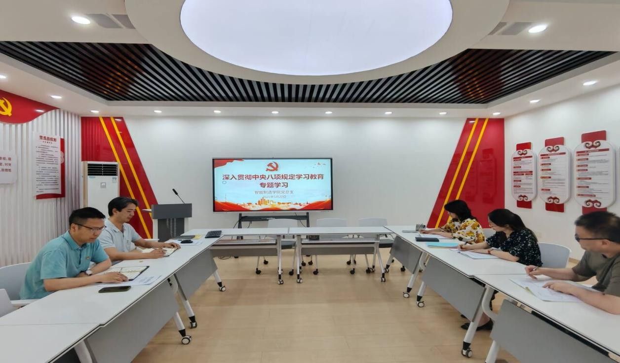2025年5月20日中午,智能制造学院党总支在奥训楼304会议室开展了深入贯彻中央八项规定精神学习教育专题学习,会议由党总支书记熊江主持,党总支副书记黄滔及总支委员、各党支部书记参加会议。首先,专职组织员杨德君同志领学了《习近平关于加强党的作风建设论述摘编》专题三:作风问题核心是党同人民群众的关系问题、“关于解决形式主义突出问题为基层减负的通知”、“纪言:八项规定改变中国”等4个学习内容;接着,与会同志围绕“...