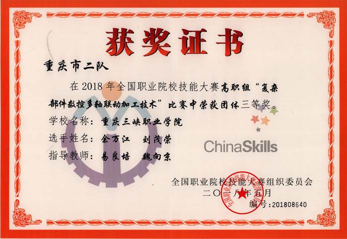 近日,2018年全国职业院校技能大赛高职组“复杂部件数控多轴联动加工技术”项目比赛在湖南工业职业技术学院成功举行,我院机械与电子工程系参赛学生余万江、刘茂荣在指导教师易良培、魏向京老师带领下,经过两天的激烈比赛,最终取得该赛项全国三等奖